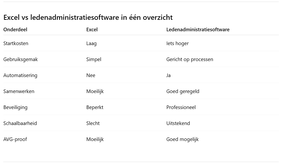 Excel is een prima startpunt, maar geen eindoplossing voor serieuze ledenadministratie.